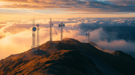 Majestic satellite antennas on a mountain peak scanning the skies, bridging earth and space