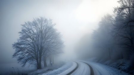 Winter landscape with road and trees in foggy misty morning.