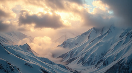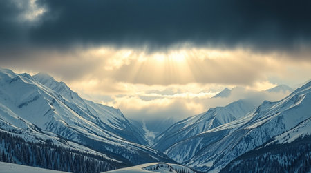 A breathtaking panorama of snow-covered mountains under a dramatic sky. Serene winter landscape.
