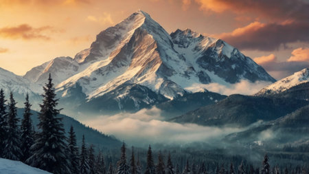 A stunning view of a snow-capped mountain rising majestically above a misty forest, capturing the serene beauty of nature at dawn. The peaceful landscape invites exploration and adventure.