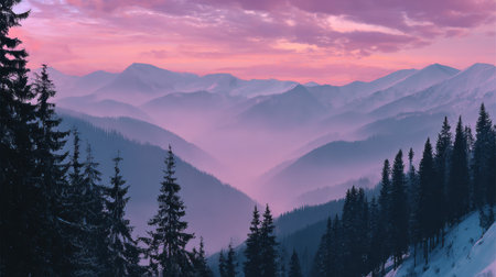Breathtaking view of a mountain landscape at dusk. Purple skies blend with misty valleys, while tall pine trees create a stunning winter atmosphere. Perfect for nature lovers.