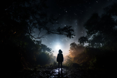Person lighting up the starry night sky with a head torch while stargazing in the mountains. . High quality photo