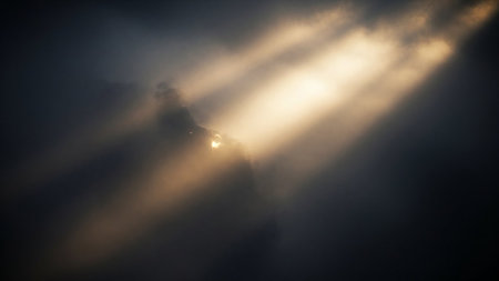 Dramatic golden sunbeams pierce through dark, shadowy clouds, creating an abstract and ethereal light effect in the sky.