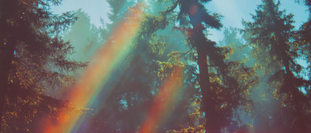 Iridescent light rays creating vibrant patterns among forest trees in natural setting