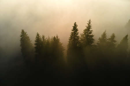 Beautiful scenery with light rays shining through foggy dark woods with evergreen trees in autumn morning. Beautiful wild forest at dawn