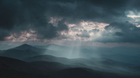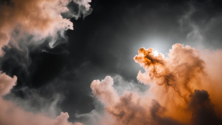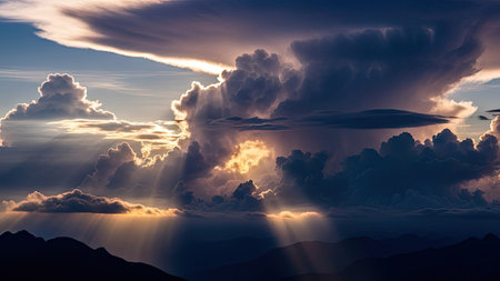 An awe-inspiring cloudscape showcases dramatic formations with vibrant colors and striking light. The composition features dark, ominous clouds contrasted by bright sun rays breaking through. This atmospheric imagery would be suitable for various editorial and commercial applications such as environmental themes.