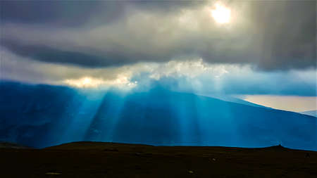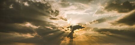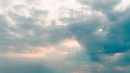 Blurred beautiful dramatic impressive meditation background. Sun rays shining through the dark blue clouds at sunset. Concept of hope or God's compassion and favor.