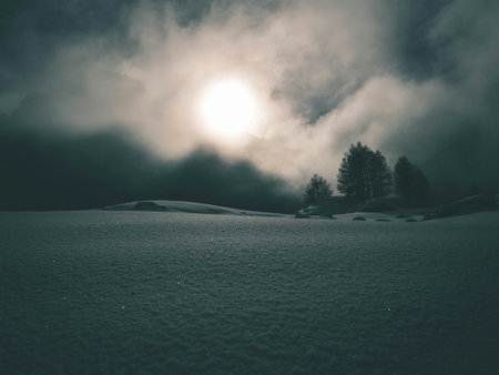 Foggy winter landscape in the mountains. Filtered image processed vintage effect.