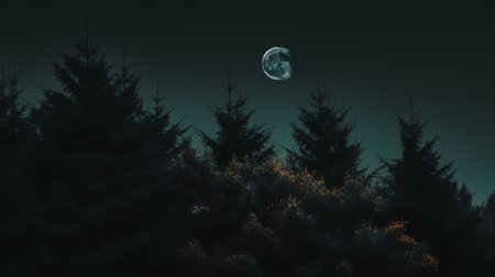 Tall Spruce Trees Bathed in Soft Orange Hue Contrasting the Deepening Blue AI Generated