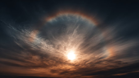 A breathtaking sunset showcases colorful clouds surrounding a radiant sun, creating a dramatic atmosphere that embodies natural beauty and serene tranquility.