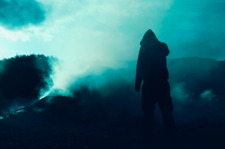 An atmospheric, moody concept. Of a lone hooded figure standing in front a burning pile with smoke covering the area.