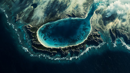 Secluded tropical island oasis surrounded by pristine azure waters and vibrant coral reefs.