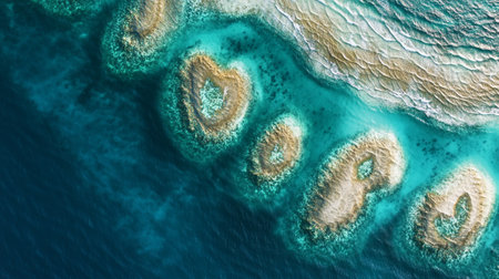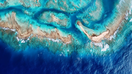 Aerial view of the coral reef and turquoise sea.