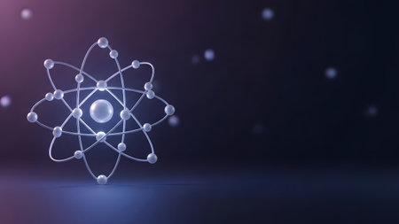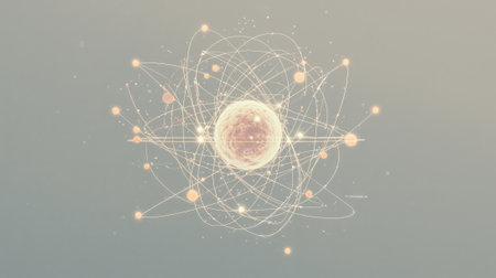 An artistic depiction of an atom is presented with glowing particles orbiting a central nucleus. The design features a soft, neutral background, emphasizing the delicate structure.