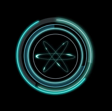 Retrofuturistic atom with orbits. Digital cyber retro design element. Atom in cyberpunk 80s style. Circular geometry for poster, cover, merch in retrowave style. Vector