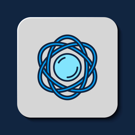 Filled outline Atom icon isolated on blue background. Symbol of science, education, nuclear physics, scientific research. Vector