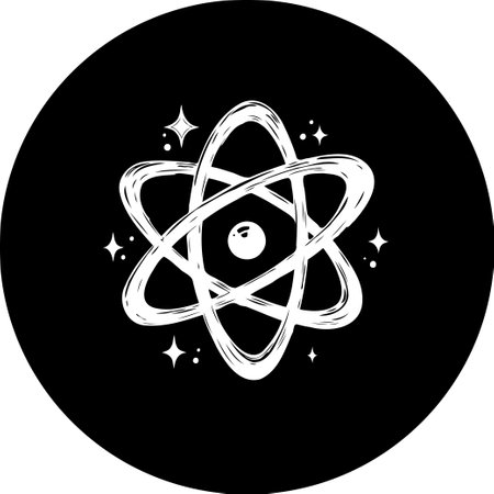 Stylized atom illustration in black and white. It depicts an atom with orbital paths, accented by small stars. The design evokes themes of science, space, and theoretical concepts.