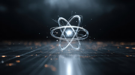 Glowing atomic model illustrates electrons orbiting a nucleus, highlighting scientific concepts of energy.