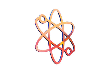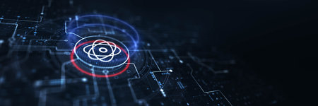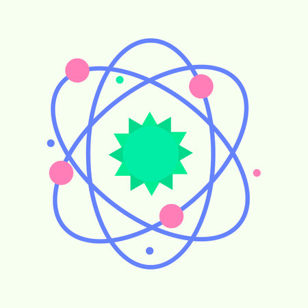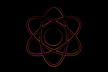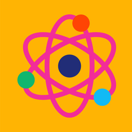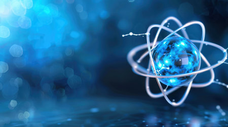 An artistic representation shows a glowing nucleus surrounded by orbiting electrons, depicting atomic structure.