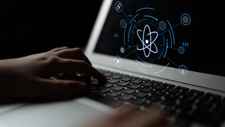 A professional in a suit cradles a luminous, high-tech atom emblem, symbolizing cutting-edge innovation and digital breakthroughs, set against a sleek dark backdrop.