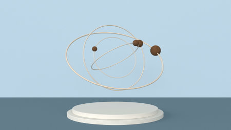 An atom model is suspended in a lab, showing intricate details of atomic structure and energy.