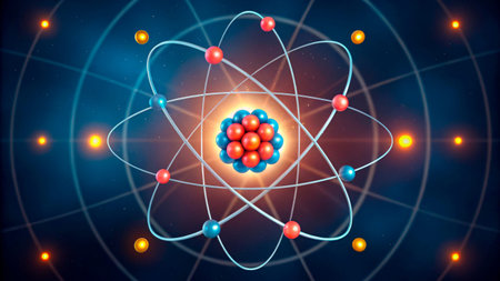 This illustration displays an atom with a central nucleus composed of protons and neutrons, surrounded by orbiting electrons. The design highlights atomic structure and energy dynamics.