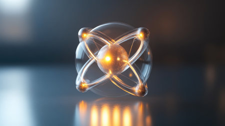 Futuristic atom and molecule model glowing in abstract minimal background, concept for medical science, dermatology, and cosmetics