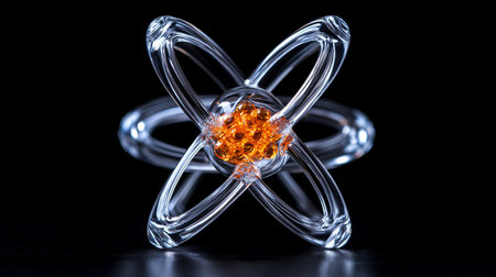 This captivating digital artwork presents an atomic structure visualization, showcasing electrons orbiting a glowing nucleus against a dark backdrop, symbolizing science.