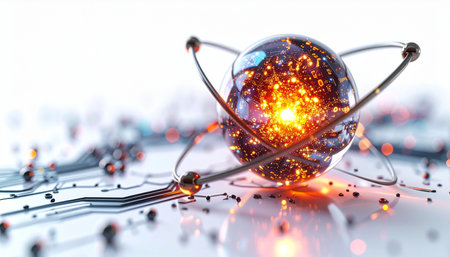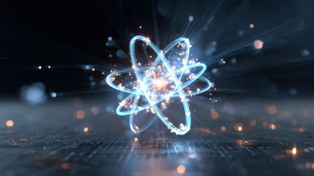 Glowing atom structure with electrons rotating around the nucleus is presented in a dark background emphasizing science and technology themes.