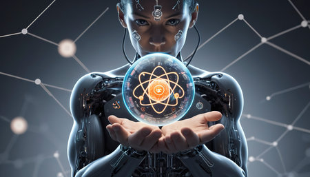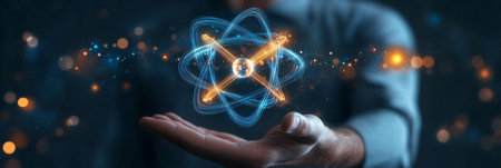 Futuristic Energy and Science Connection Man Holding Digital Atom Model with Quantum Correlations