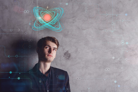 Thoughtful young european businessman with digital atom on concrete background with circuit and copyspace. Technology and innovation concept. Double exposure