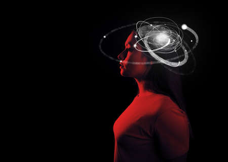 Psychology and brain work, cognitive sciences. A young woman in profile, a sketch of spinning thoughts in her head, contrasting red toning