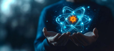 Man s Hands Cradle a Glowing Atom Symbol, Emitting Energy Against a Dark Futuristic Background.