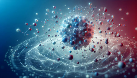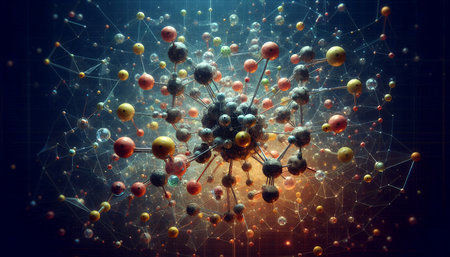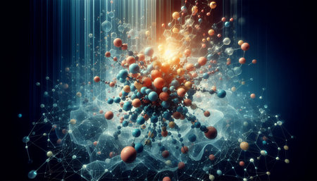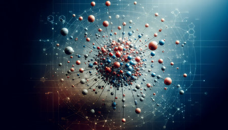 Vibrant abstract illustration of atomic structure showcasing electrons and particles against a colorful background, perfect for science and education themes.