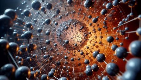 This abstract image showcases an atomic structure with glowing particles and intricate metallic wires. The dark background enhances the futuristic and scientific vibe, making it ideal for technology and research themes.