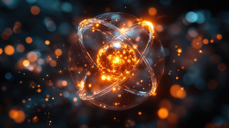 This captivating digital artwork presents an atomic structure visualization, showcasing electrons orbiting a glowing nucleus against a dark backdrop, symbolizing science.