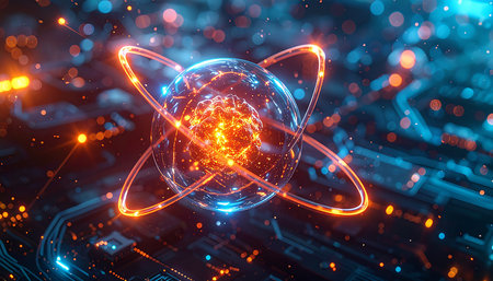 Glowing atom structure with electrons rotating around the nucleus is presented in a dark background emphasizing science and technology themes.