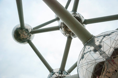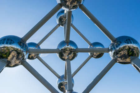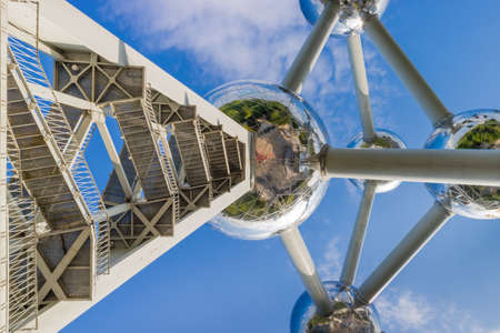 Panoramic view of Atomium from below. Atomium is a historical tourist attraction situated in Brussels, Belgium.