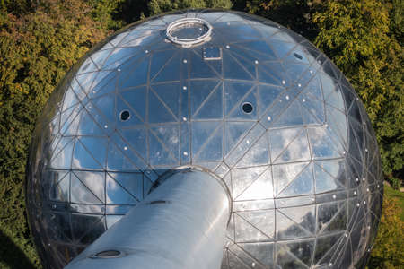 Brussels, Belgium - September 25, 2018: Closeup of one shining metalic sphere of the Atomium monument. Shot from above with green Laken Park as background.