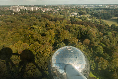 Brussels, Belgium - September 25, 2018: One shining metalic sphere and shadows of others of the Atomium monument. Shot from above with green Laken Park as background.