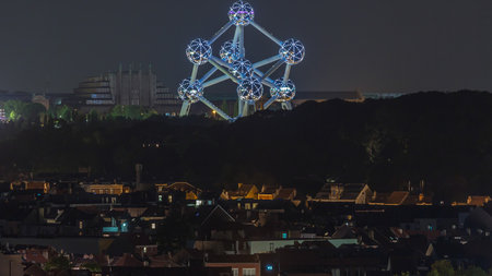 Aerial view of night city skyline timelapse with the Atomium in Brussels, Belgium.