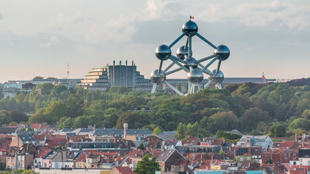 Aerial view of city skyline timelapse with the Atomium in Brussels, Belgium.