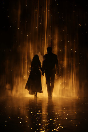 Silhouette of a couple in love on a background of light and fire