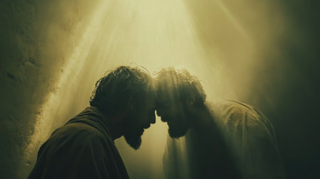A captivating scene of mysterious figures in shadow, surrounded by a fog that creates an ethereal light effect. The atmosphere evokes intrigue and emotion.