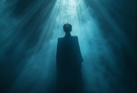 A mysterious figure stands in deep water, enveloped in an enigmatic glow. Rays of light pierce the surface, creating a surreal atmosphere that evokes a sense of wonder and intrigue.