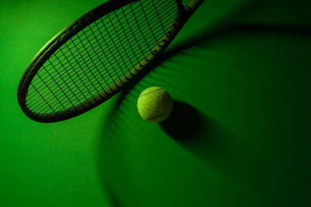 tennis ball with racket on a green background. The concept of sports.