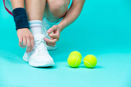 Closeup on Legs of Caucasian Female Tennis Player Grasping Tennis Sneakers Shoelaces Over Blue. Horizontal Image Composition