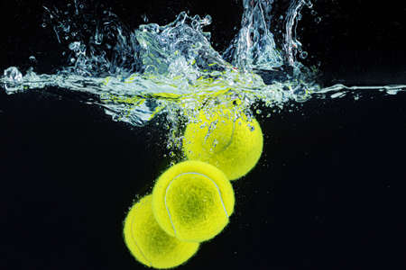 Tennis ball falling in water with a splash against dark background