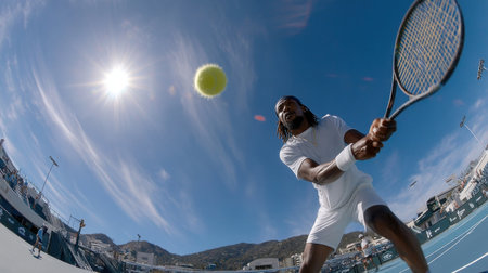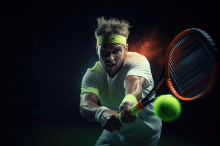 A tennis player hits the ball with his racket. tennis, summer sport, olympics, AI generated