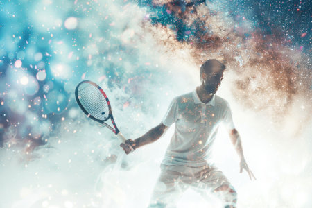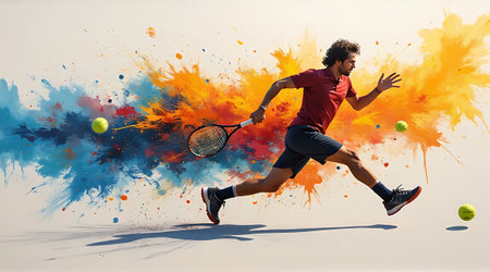 A male tennis player runs swiftly across a textured surface showcasing athleticism Bright splashes of orange and blue paint create a striking background
